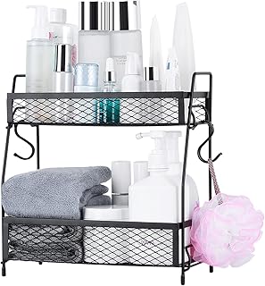 Homeweeks スパイスラック キッチンキャビネットオーガナイザー 2段スパイスオーガナイザー 5フック バスルーム整理 カウンタートップホルダー パントリーシェルフ 調味料収納棚 シンクラック キッチン用 (ブラック)