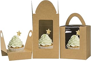 カップケーキボックス 50個 個別のペーパーカップケーキキャリア ウィンドウインサートとハンドル付き ペストリーケーキコンテナ ベーカリーラッピングパーティー記念品パッケージ