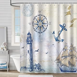 Bonhause 航海 ヨット シャワーカーテン 12個のフック付き 灯台 コンパス アンカー 装飾 バスカーテン 72 x 72インチ ポリエステル生地 防水バスルームカーテン